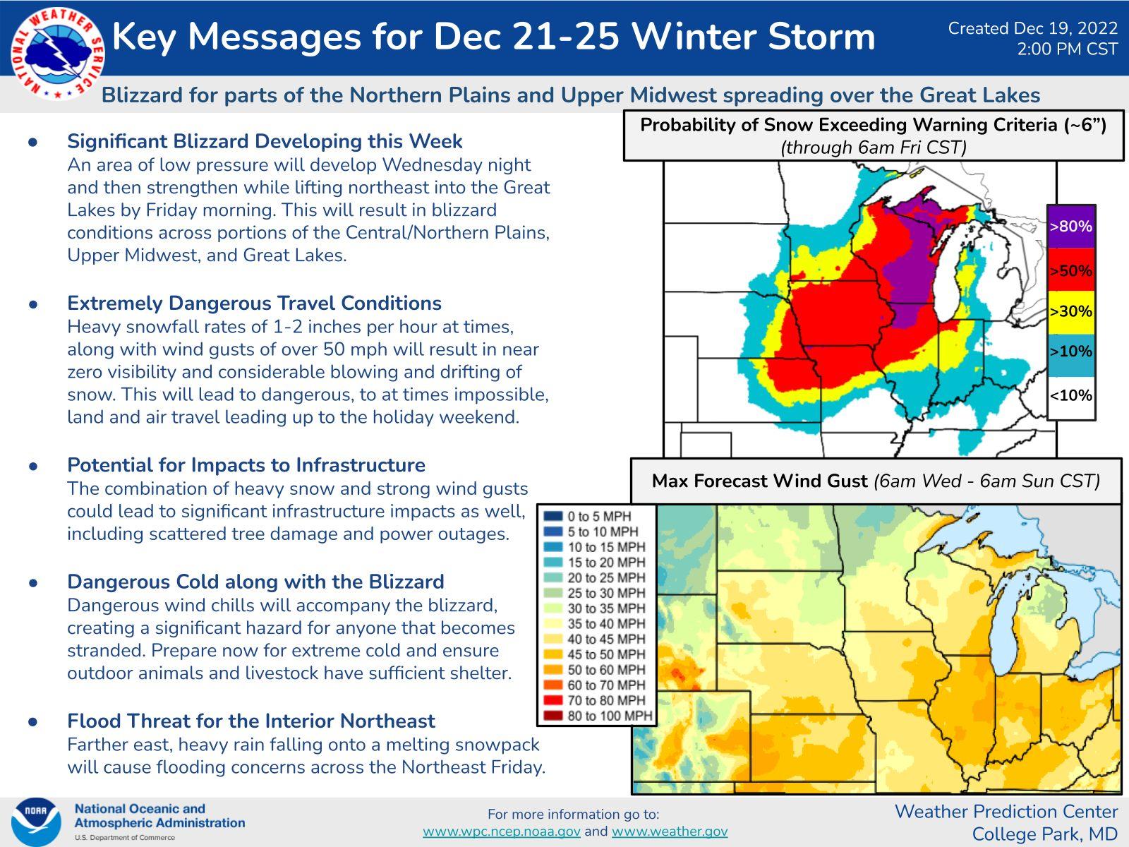 December 22, 2022We have had some challenges over the last week or so with the winter weather that blanketed the region. Unfortunately it appears we are in for some more, along with high winds and freezing temperatures. For what to expect, go here: https://www.weather.gov/arx/12212022winterstorm