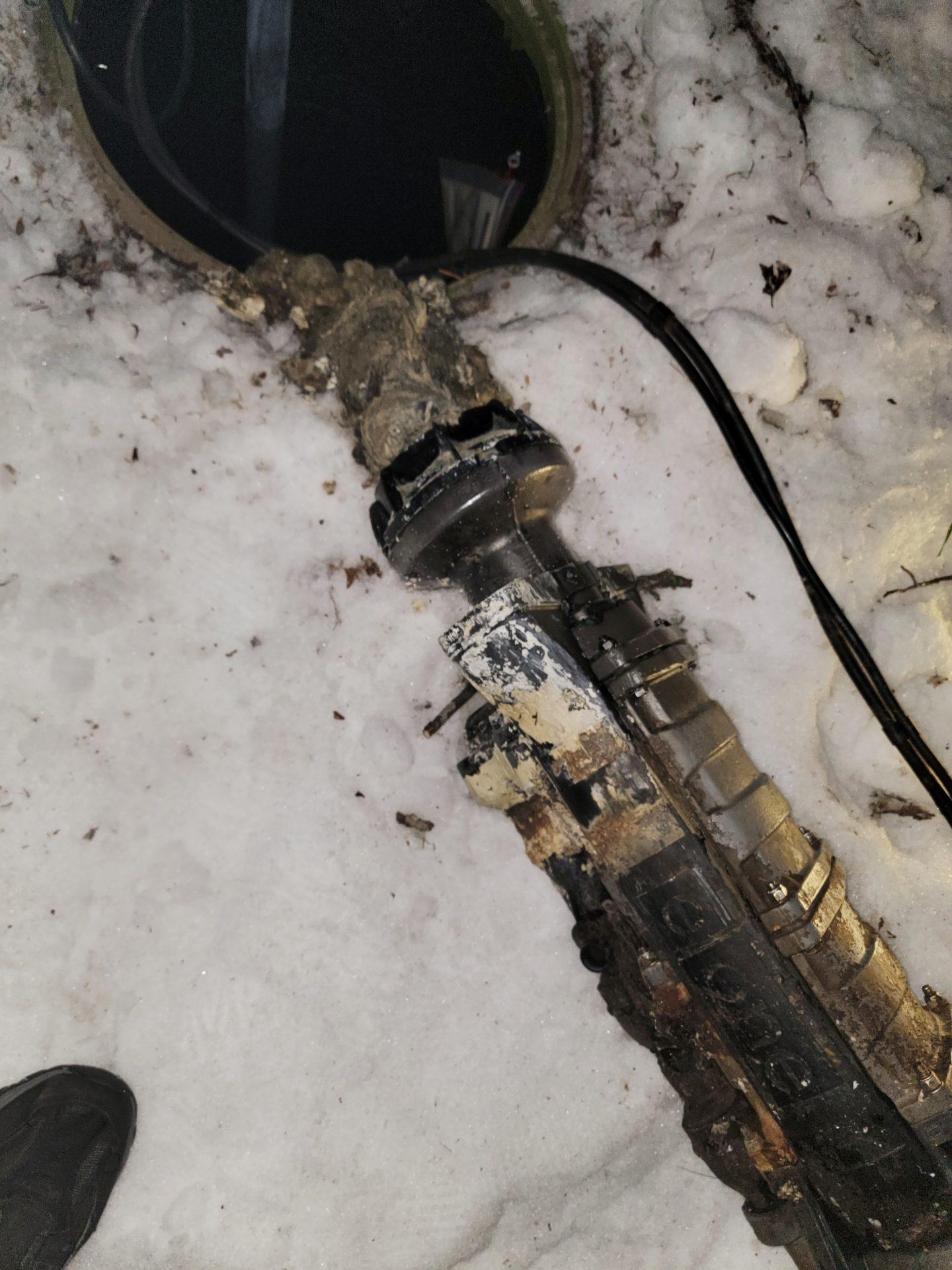 The images attached are from late last night around midnight when a grinder pump burnt up. As you can see in the photos the reason is obvious. Grinder pumps have lights and alarms that will notify if there’s an issue. If you notice any of these alarms please call us before it’s too late.
